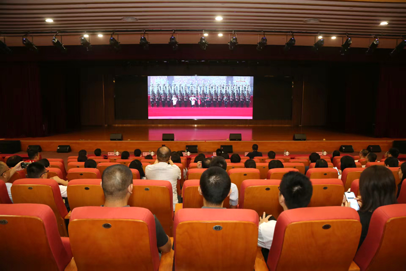 上午9时,在学校学术报告厅、各二级学院会议室、教室、饭堂等场所,师生们通过大屏小屏观看大会直播。当激昂的军乐响起,礼炮声划破长空,全体师生肃立,共同唱响国歌,表达对祖国的无限热爱与崇高敬意。