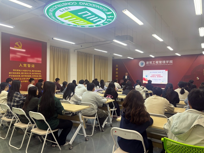黄亮祥以《弘扬伟大抗战精神,筑梦现代化,建功新时代》为题展开讲授。在与学生的亲切互动中,引导学生从历史的坐标中汲取精神力量,迈向人生的新起点。课程深入阐释了伟大抗战精神的核心内涵与其在新时代绽放的光芒,还聚焦中国式现代化进程中的广东使命与实践,鼓励学生关注广东区域发展、粤港澳大湾区国家战略、勇担时代责任。他表示,弘扬伟大抗战精神,不在于响亮的口号,而在于绘制的每一张精准的图纸,在于监造的每一处安全的工地,在于贡献的每一座精品工程。最后,他号召全体同学筑梦现代化,建功新时代,筑牢“理想信念的基石”,磨砺“精益求精的技艺”,锻造“攻坚克难的担当”,涵养“以人为本的情怀”。